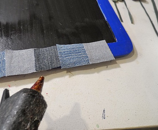 - Склейте горячим клеем квадраты по всей границе, немного перекрывая друг друга по ходу движения и чередуя разные оттенки и типы джинсовой ткани для некоторого контраста.
