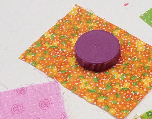 Обведите вокруг ткани круглую пластиковую крышку. Ножницами вырежьте круг.