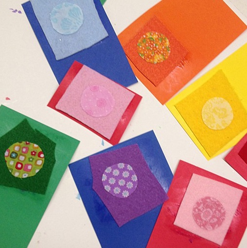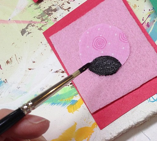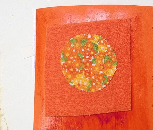 - Приклейте тканевый кружок к фетру. Приклейте фетр к картону.