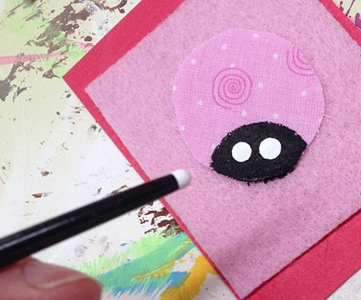 Когда высохнет, используйте зубочистку, чтобы нанести черный цвет на белки глаз. Ножницами обрежьте божью коровку, оставив войлочную кайму. Прикрепите магнит к спинке с помощью белого крафтового клея.