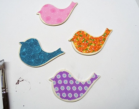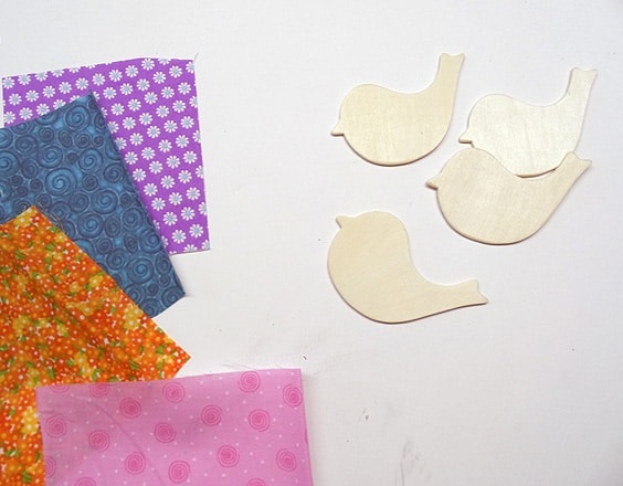Далее вы собираетесь прикрепить ткань к птицам, используя среду для декупажа, такую как Mod Podge Outdoor. Нанесите декупаж на изнанку ткани и прикрепите к дереву, пока не делайте декупаж поверх ткани. Относитесь к нему так, как будто вы просто приклеиваете ткань на место.