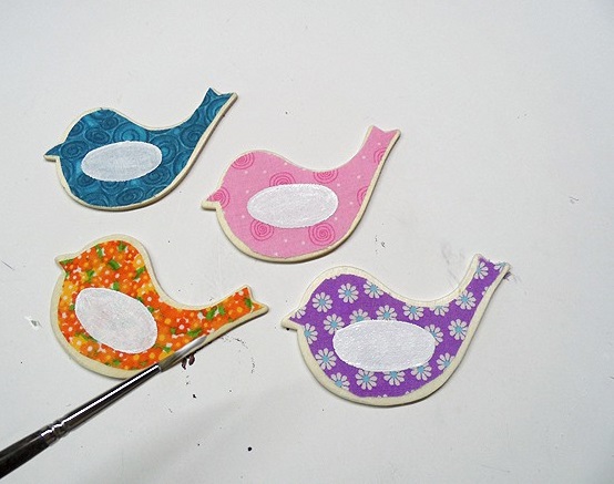 После того, как он высохнет, используйте кисть для подводки, чтобы нарисовать овал в центре каждой птички, обтянутой тканью. Это тоже должно полностью высохнуть.