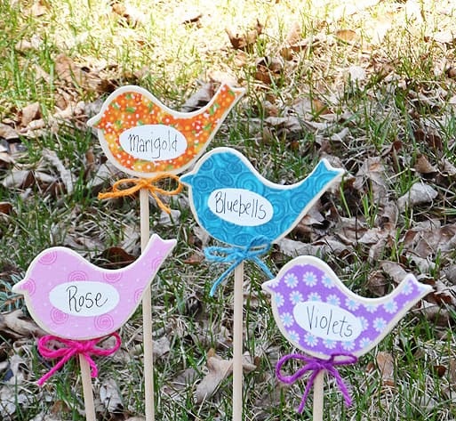 Эти маркеры для растений действительно легко сделать. Я использовала эти милые деревянные вырезы в форме птиц, которые нашла в Michaels. Ткань, которую я покупаю в WalMart, это те толстые четвертинки, которые вы можете найти на полке рядом с отделом тканей / рукоделия.