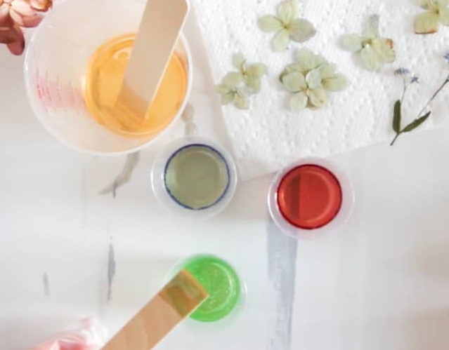 - Равномерно разделите смешанную смолу на три дополнительных стакана (всего четыре части).