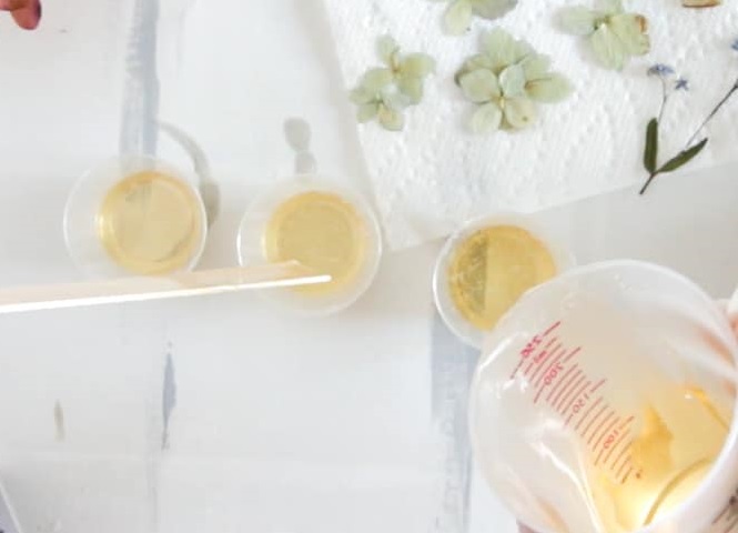 - Налейте больше цветной смолы в каждую форму до верха, одновременно покрывая спрессованные цветы.