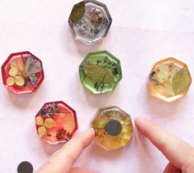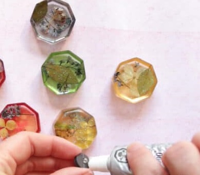 - Выдавите каплю клея E6000 на магнит и прижмите магнит к центру смолы (той стороне, которая находилась внутри формы). Повторите для всех магнитов.
