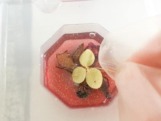 - Посыпьте немного мелкого блеска поверх каждых 2/3 заполненных форм для смолы. Затем поместите смесь прессованных цветов и листьев внутрь каждой формы.