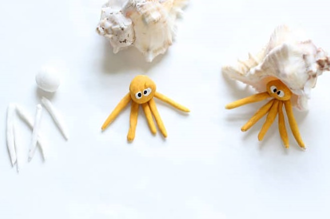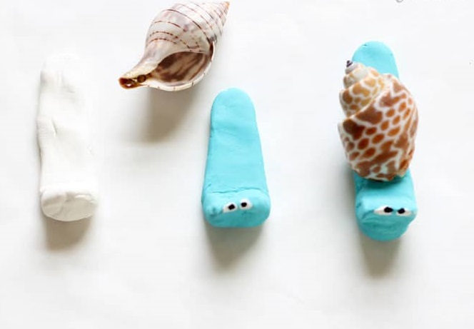 - Раскатайте, ущипните и сформируйте из высохшей на воздухе глины необходимые части существ, чтобы удерживать раковины. Дайте высохнуть в течение ночи.