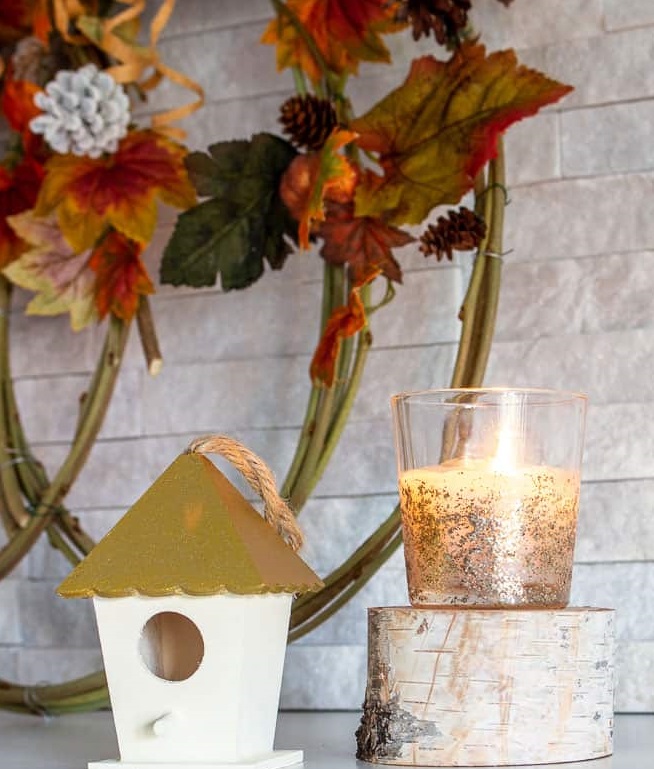 Я добавил тыквенный венок на каминную каминную полку вместе с несколькими раскрашенными скворечниками (перепрофилированными из прошлогоднего деревенского осеннего украшения ) и сверкающими вотивными подсвечниками.