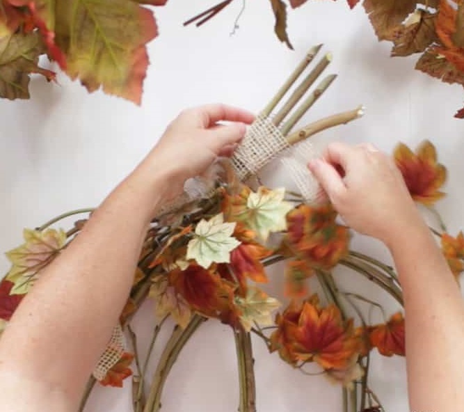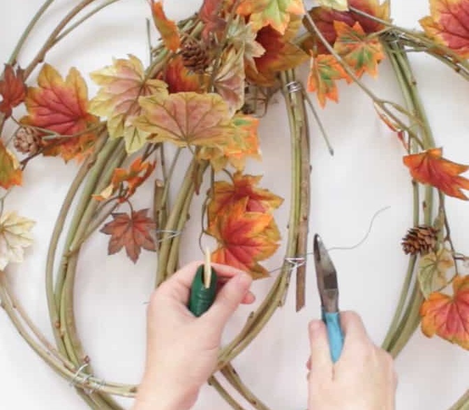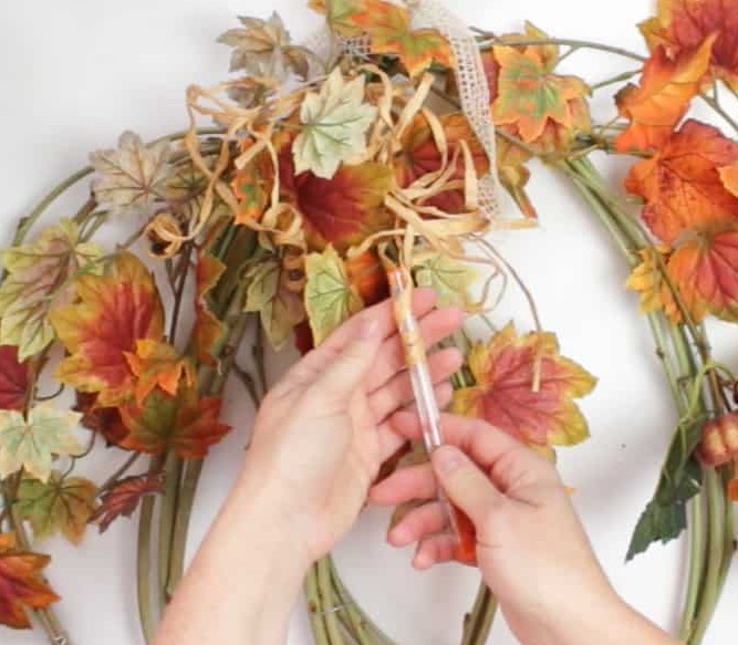 - Положите три части осенней листвы на верхнюю часть тыквы. Прикрепите к форме тыквенного венка цветочную проволоку.