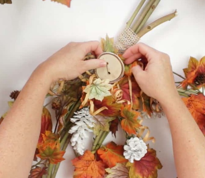 Прикрепите листву к тыквенному венку с помощью цветочной проволоки. При необходимости закрепите в местах.