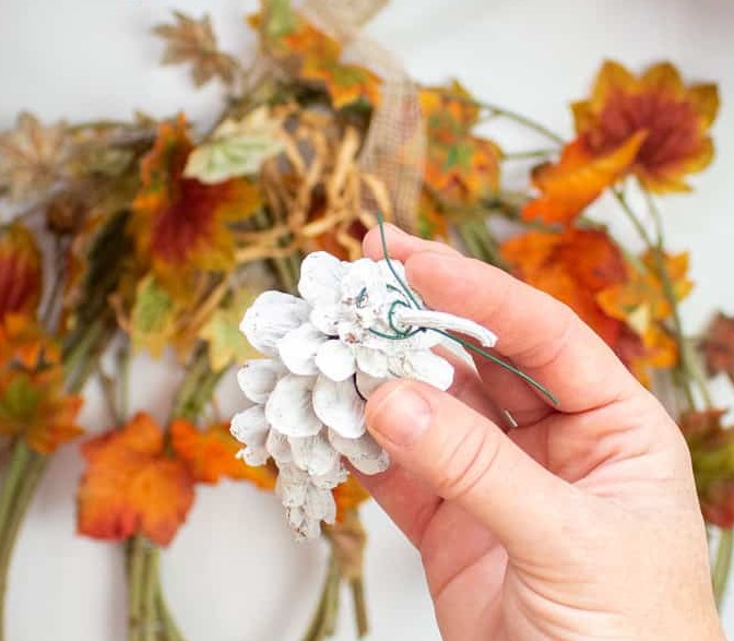 Добавьте к тыквенному гневу сосновые шишки случайным образом, используя цветочную проволоку.