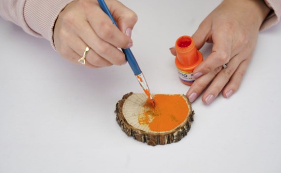 Используя краску для творчества, нанесите 1-2 слоя краски (оранжевой или желаемого цвета) на одну сторону деревянного среза.