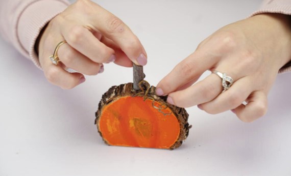 Когда краска на тыкве полностью высохнет, прикрепите пружину из проволоки к верхней части деревянного среза.